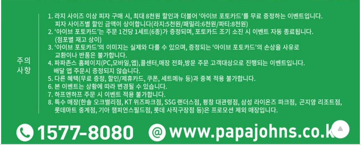 - 파파존스 피자 주문 : 파파존스에서 일정 금액 이상의 피자를 주문하면 아이브 포토카드를 받을 수 있습니다. 이 때, 프로모션 코드나 특정 메뉴를 주문하는 것이 필요할 수 있습니다.