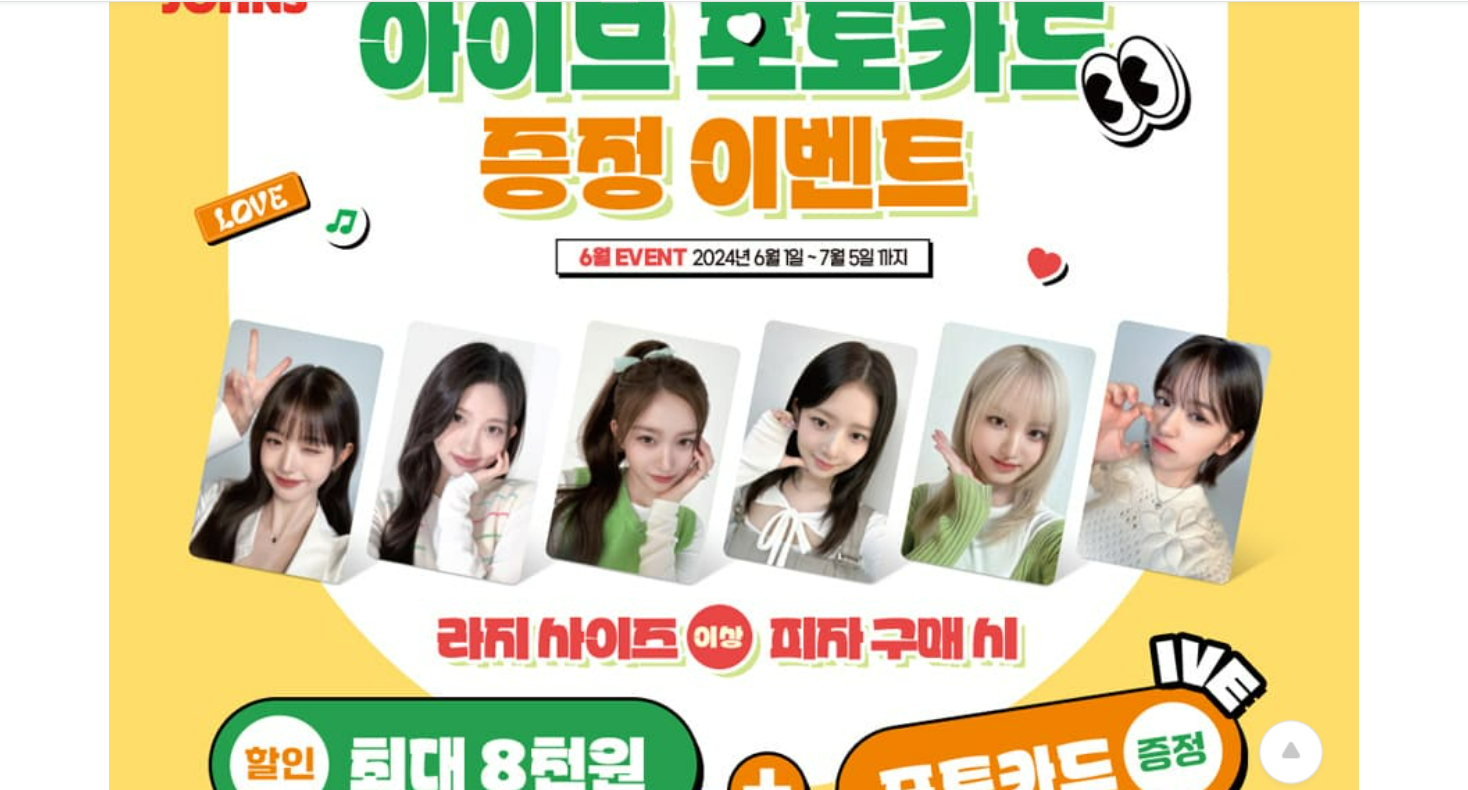 피자 라지 사이즈 이상 피자 구매시, 최대 8천원 할인과 더불어 '아이브 포토카드'를 무료 증정하는 이벤트입니다.